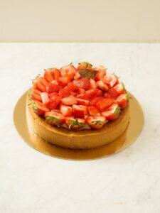 En härlig jordgubbstårta med svenska jordgubbar, vaniljkräm på en mandelbotten.