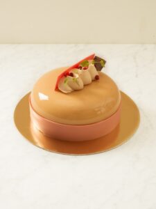 En tårta med ljuvlig sötma, smak av karamell och hallon på en mandelbotten.