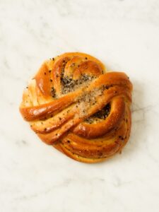 En mjuk vetebulle med smörfyllning som har en ljuvlig smak av smör, kola och kardemumma.