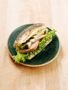 Frukostmacka gjord på valfri fralla fylld med salladsblad, smör, leverpastej och picklad gurka.